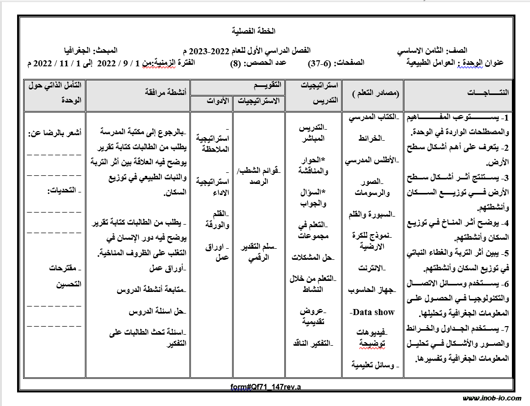 نموذج Word الخطة الفصلية + تحليل محتوى لمادة الاجتماعيات التاريخ - الجغرافيا - التربية الوطنية - الصف الثامن الفصل الاول 2023-2024