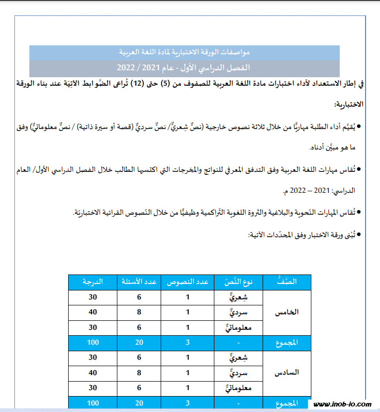 نموذج مواصفات الاختبار لمادة اللغة العربية الصف الخامس الفصل الاول