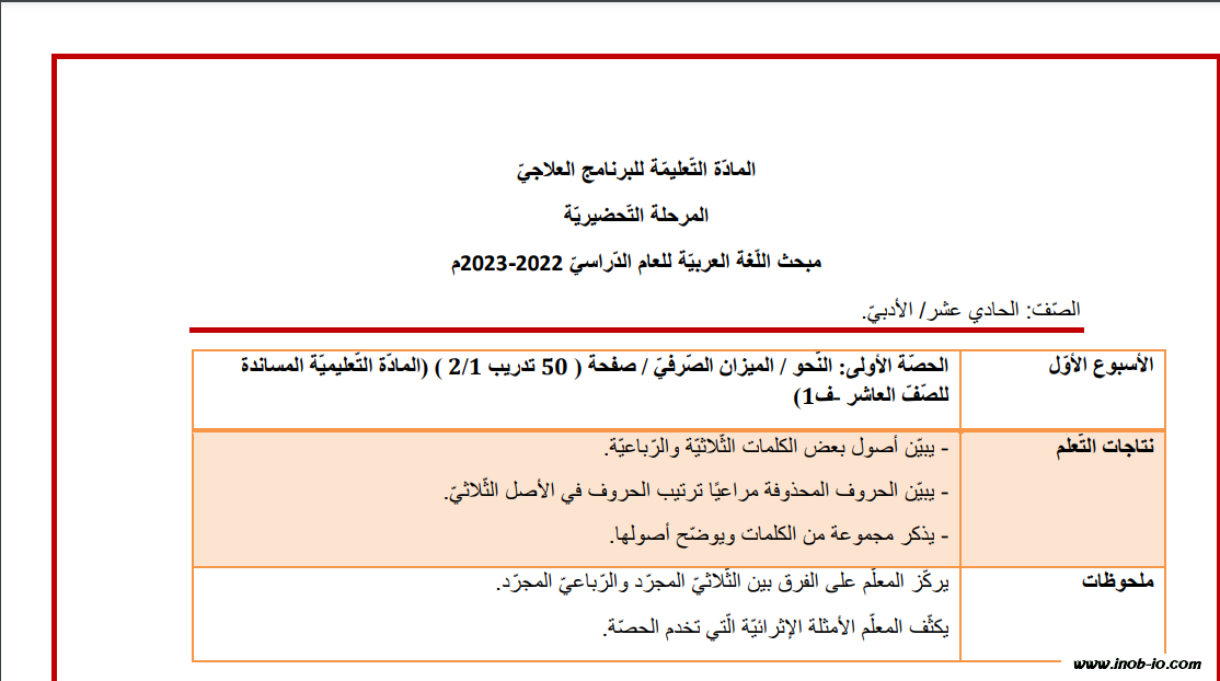 المادة التعليمية لبرنامج العلاجي المرحلة التحضيرية لمادة اللغة العربية الصف الحادي عشر الادبي 2022-2023