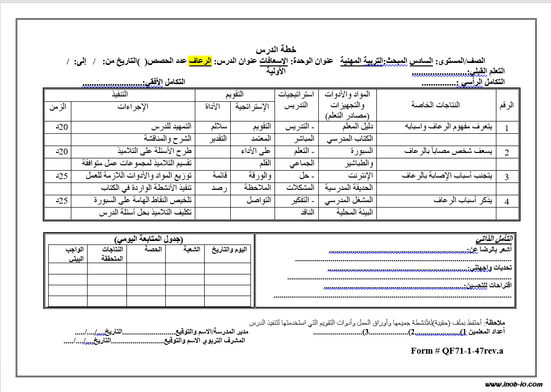 نموذج Word قابل للتعديل دفتر التحضير لمادة التربية المهنية الصف السادس الفصل الاول 2023