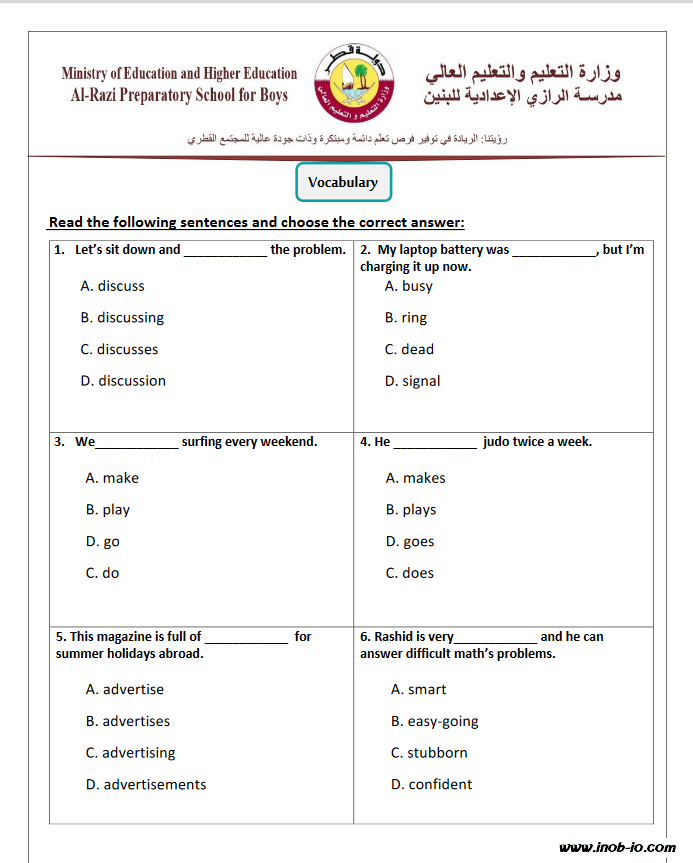 مراجعة مفردات لمادة اللغة الانجليزية الصف الثامن الفصل الاول المنهاج القطري