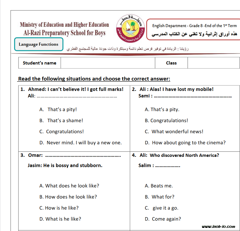 ملزمة اوراق عمل منوعة لمادة اللغة الانجليزية الصف الثامن الفصل الاول المنهاج القطري