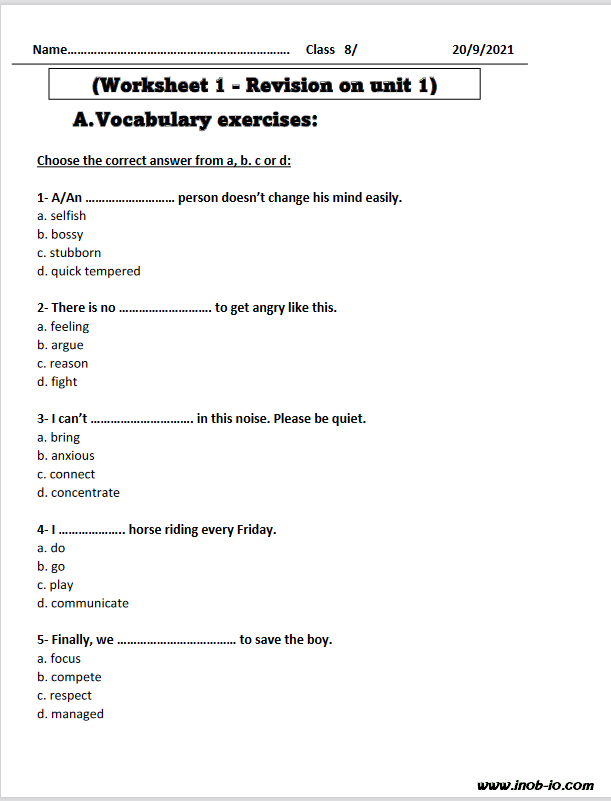 ورقة عمل نموذج 1 لمادة اللغة الانجليزية الصف الثامن الفصل الاول المنهاج القطري