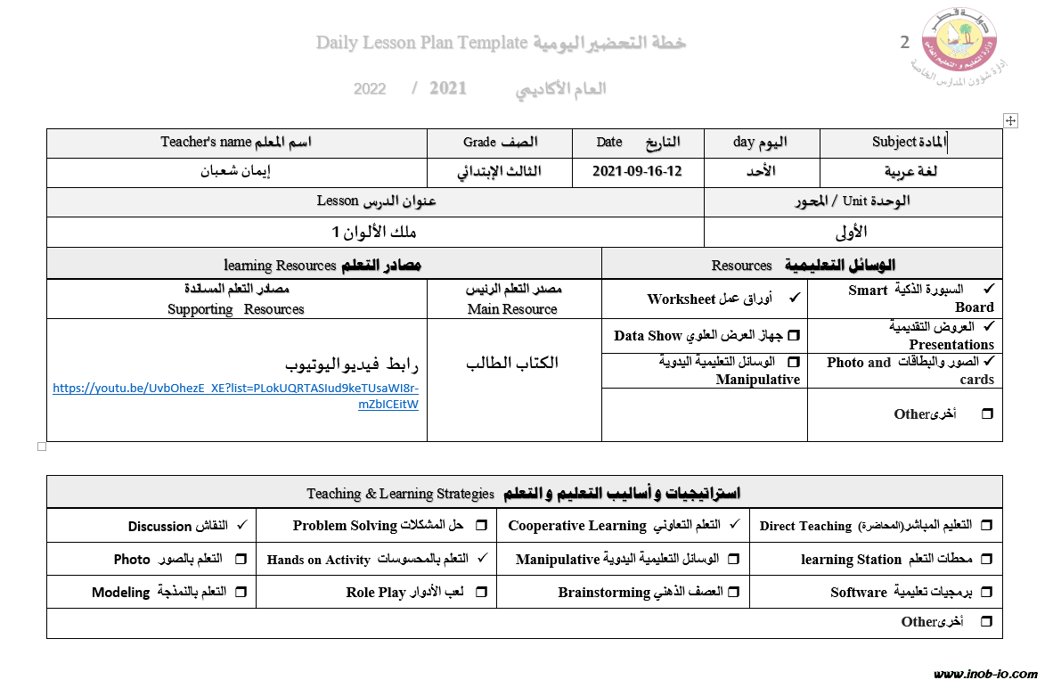 خطة درس القراءة ملك الألوان لمادة اللغة العربية الصف الثالث الفصل الاول المنهاج القطري