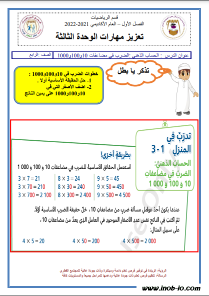 تعزيز مهارات الوحدة الثالثة لمادة الرياضيات الصف الرابع الفصل الاول المنهاج القطري