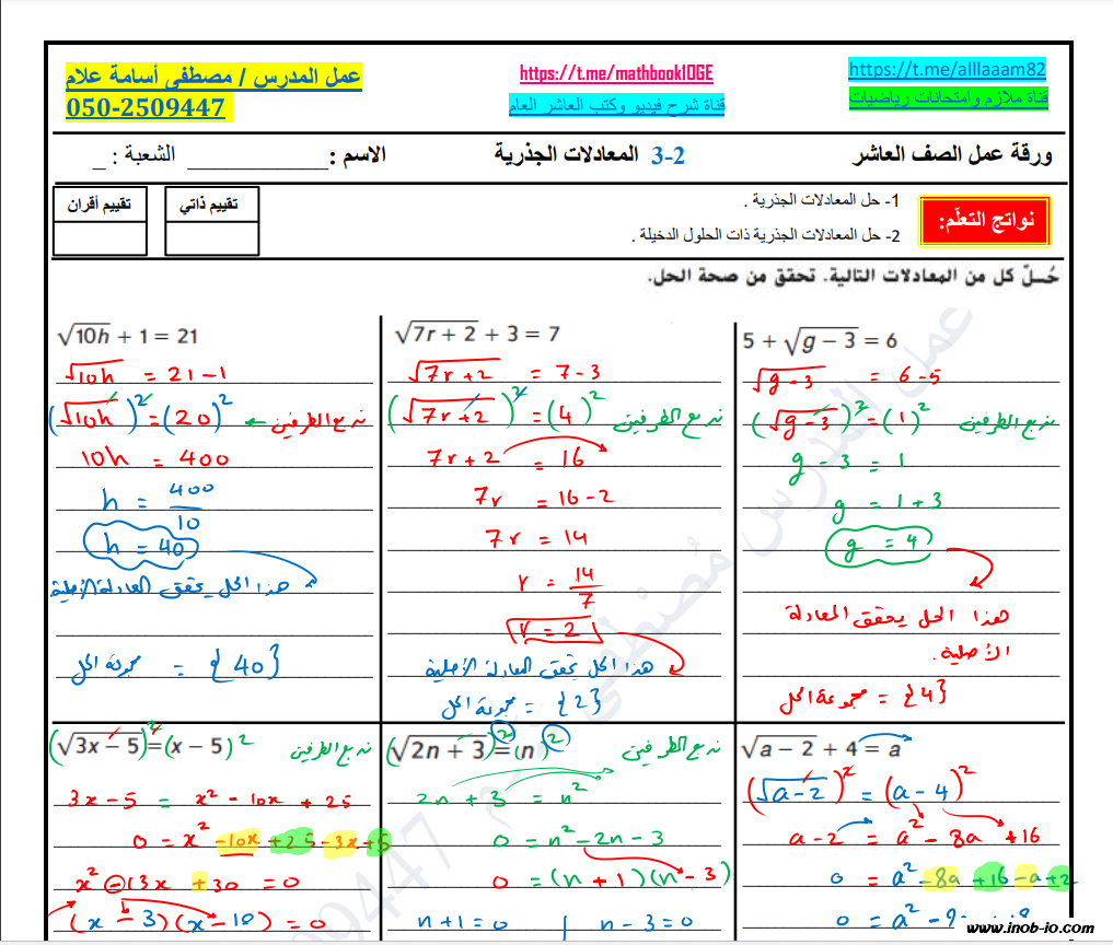 ورقة عمل مع الحلول المعادلات الجذرية لمادة الرياضيات المتكاملة الصف العاشر الفصل الاول