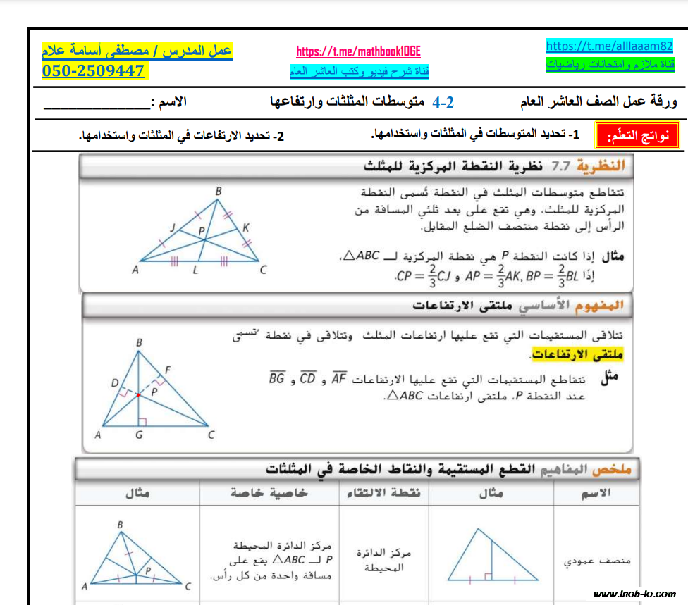 ورقة عمل متوسطات المثلثات وارتفاعها لمادة الرياضيات المتكاملة الصف العاشر الفصل الاول