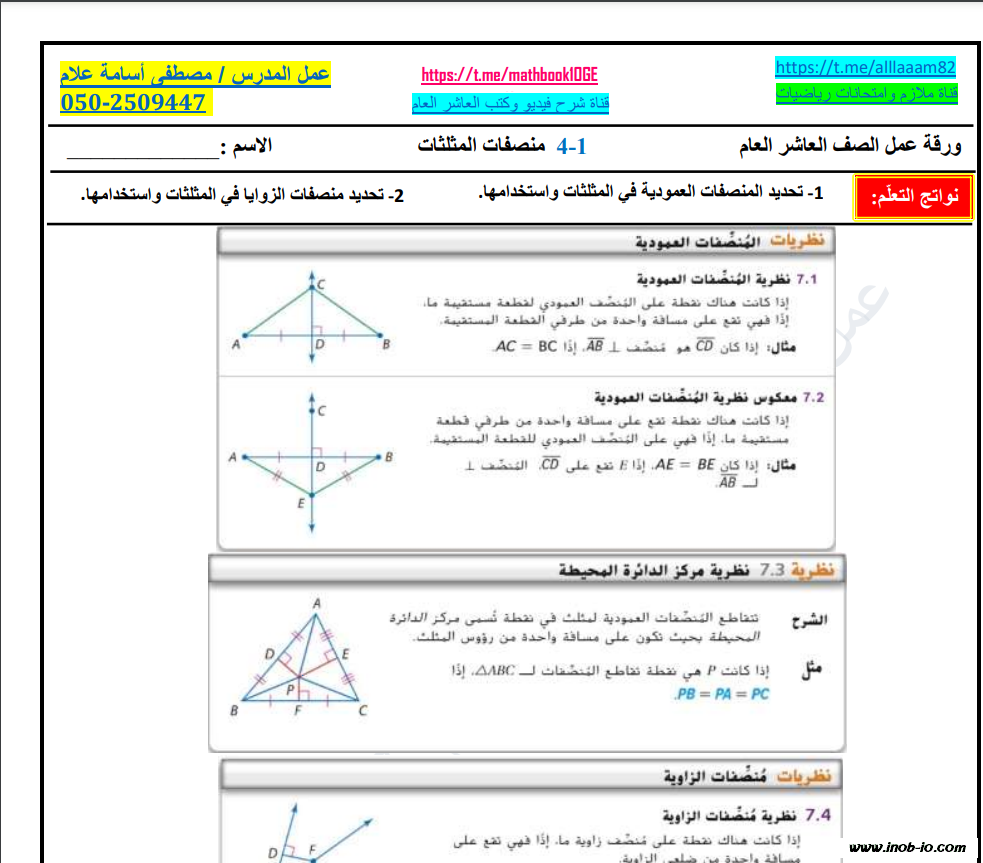 ورقة عمل منصفات المثلثات لمادة الرياضيات المتكاملة الصف العاشر الفصل الاول