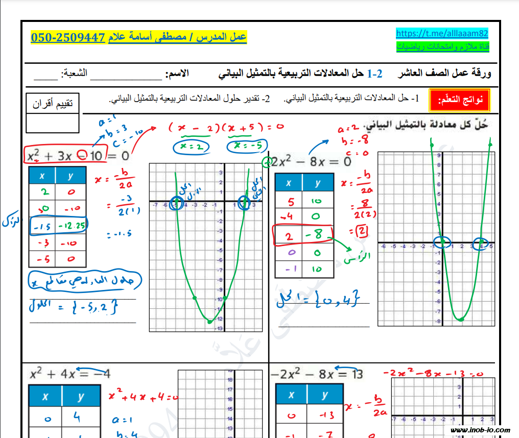 ورقة عمل مع الحلول تحويلات الدوال التربيعية لمادة الرياضيات المتكاملة الصف العاشر الفصل الاول