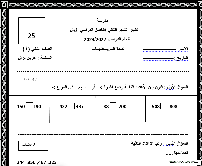 امتحان الثاني لمادة الرياضيات الصف الثاني الفصل الاول نموذج 6
