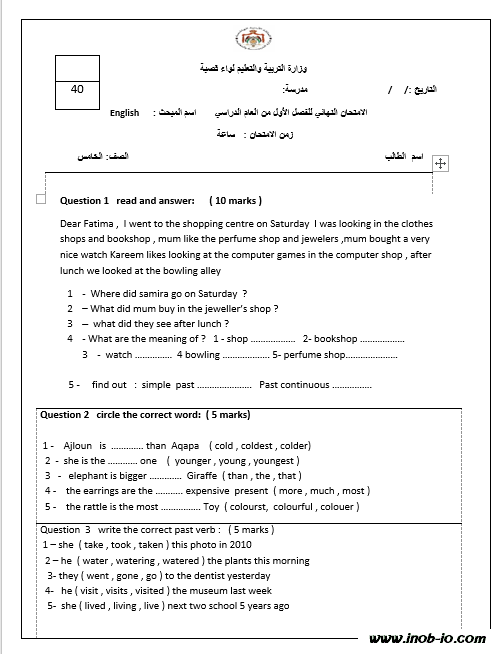 اختبار نهائي مادة اللغة الإنجليزية الصف الخامس الفصل الدراسي الأول المنهاج الأردني