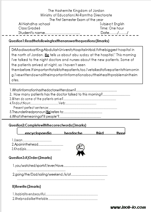 اختبار نهائي مادة اللغة الإنجليزية الصف السادس الفصل الدراسي الأول المنهاج الأردني
