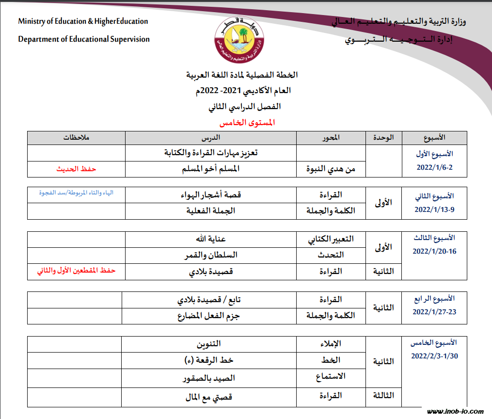 الخطة الفصلية لمادة اللغة العربية الصف الخامس الفصل الثاني 2022-2023