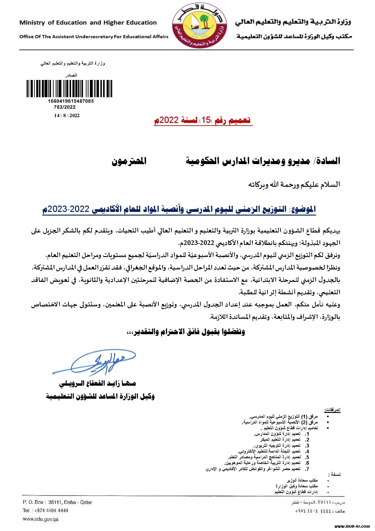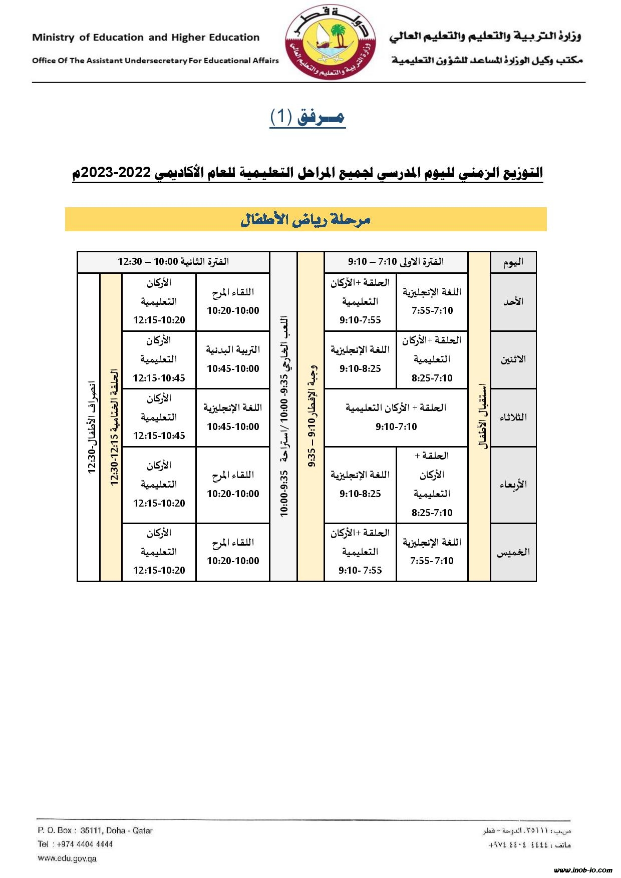 التوزيع الزمني لليوم المدرسي وأنصبة المواد للعام الاكاديمي المنهاج القطري 2022-2023
