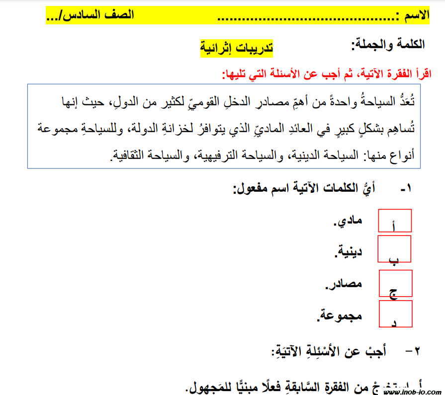 تدريبات إثرائية منوعة لمادة اللغة العربية الصف السادس الفصل الثاني المنهاج القطري