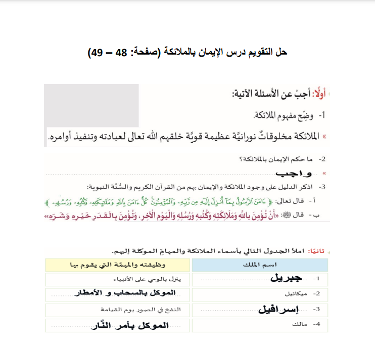 حل التقويم درس الإيمان بالملائكة لمادة التربية الاسلامية ( الشرعية ) الصف الخامس الفصل الثاني المنهاج القطري