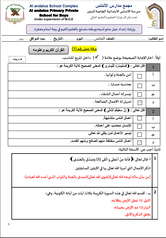 ملزمة الأندلس مجابة لمادة التربية الاسلامية ( الشرعية ) الصف الخامس الفصل الثاني المنهاج القطري