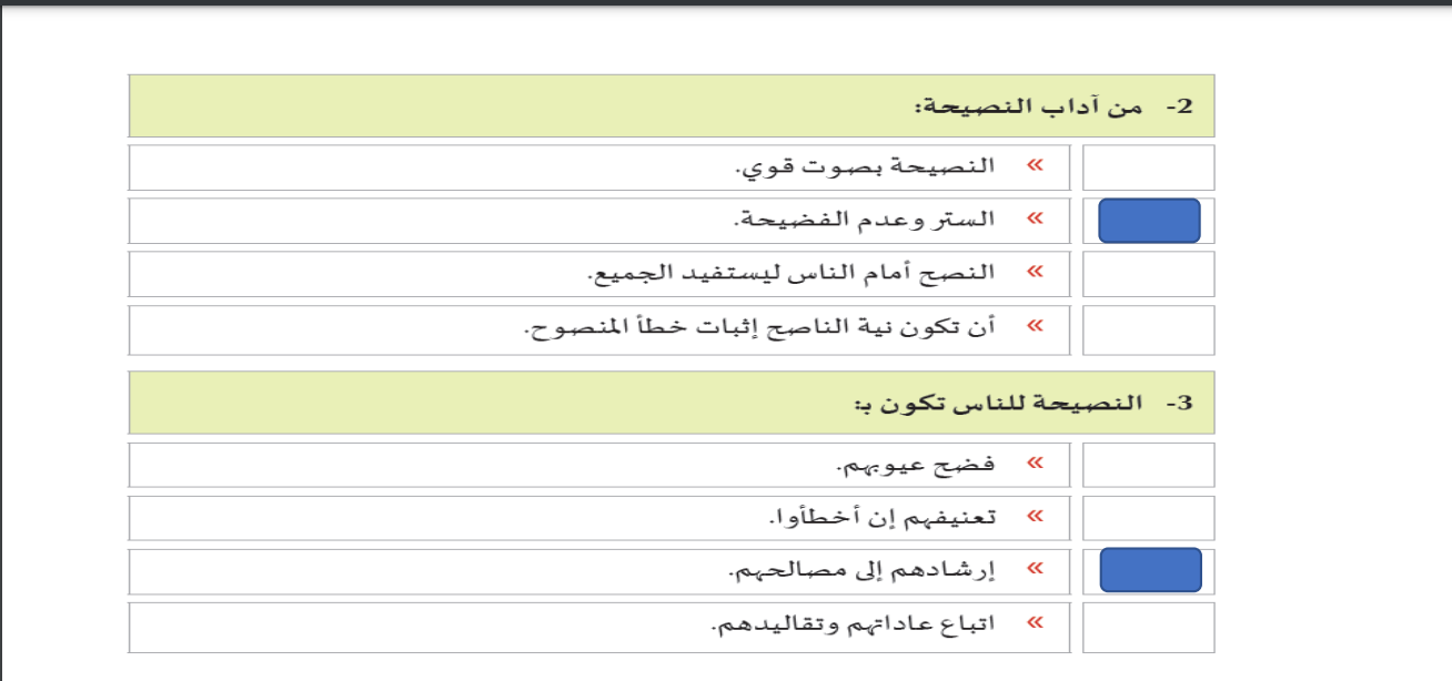 التدريبات مع الاجابات لدرس الدين النصيحه لمادة الشرعية الصف السابع الفصل الثاني المنهاج القطري