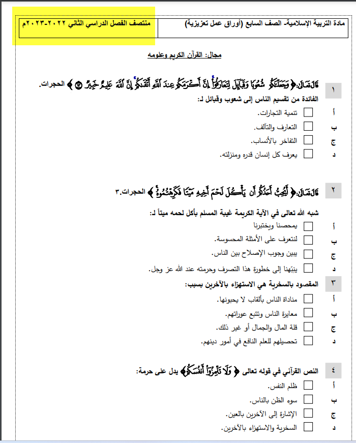 تدريبات اثرائية + اوراق عمل مع الاجابات 2023 لمادة الشرعية الصف السابع الفصل الثاني المنهاج القطري