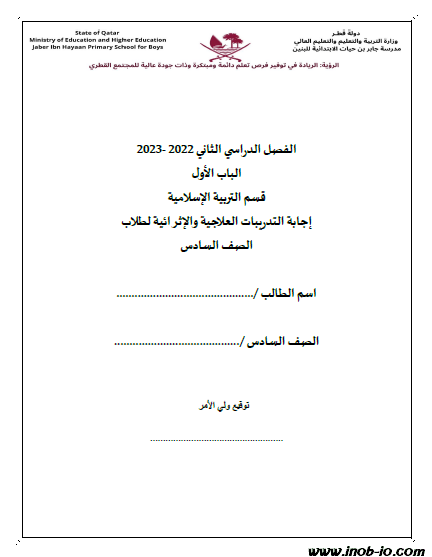 PDF أجابات تدريبات اثرائية لمادة التربية الأسلامية لــ منتصف الفصل الثاني الصف السادس