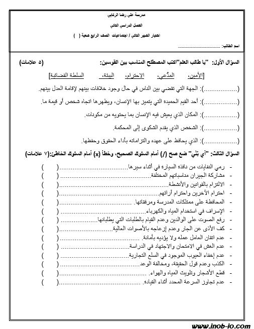 نموذج اختبار الشهر الثاني مادة الاجتماعيات الصف الرابع الفصل الثاني