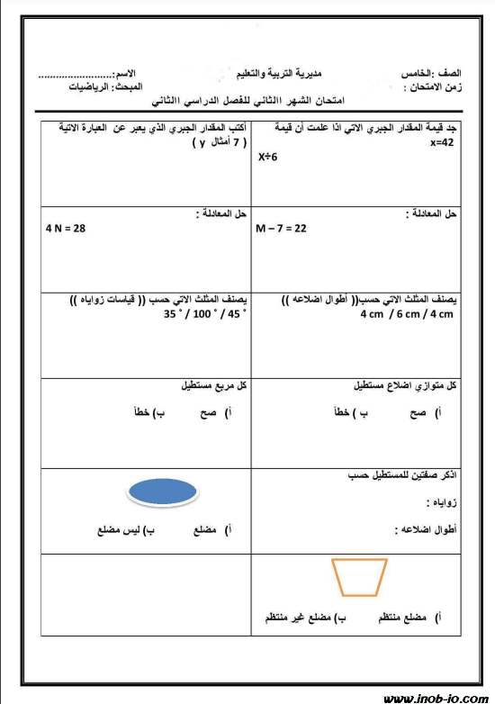 نموذج اختبار الشهر الثاني مادة الرياضيات الصف الخامس الفصل الثاني