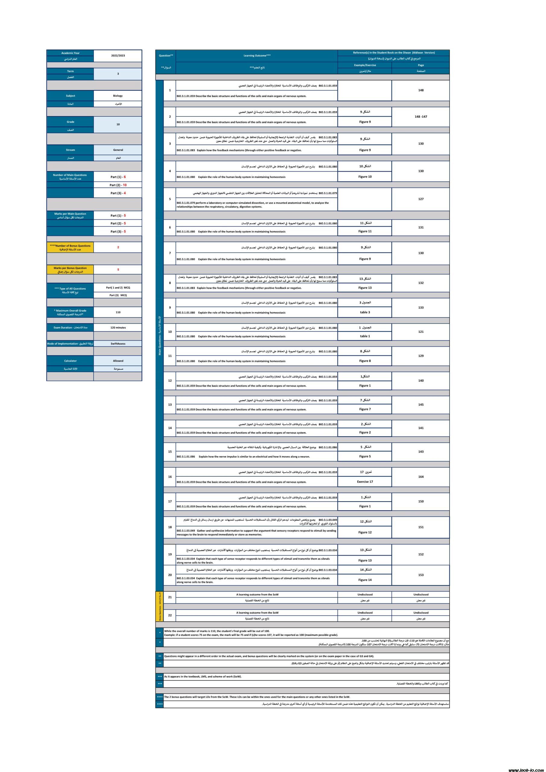 هيكل الامتحان النهائي لمادة الأحياء الصف العاشر عام الفصل الثالث 2022-2023