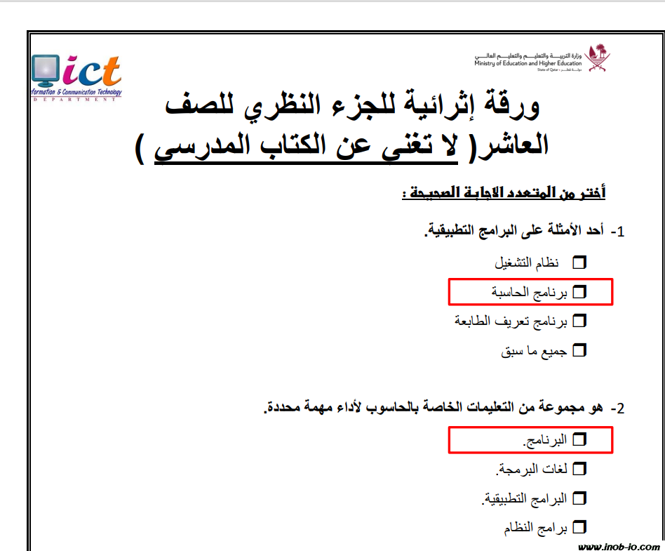 مجموعة اوراق اثرائية لمادة الحوسبة وتكنلوجيا المعلومات المستوى العاشر الفصل الثاني