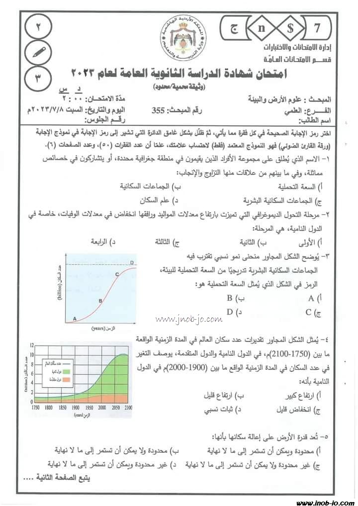 نموذج اختبار الوزارة لمادة علوم الارض الصف الثاني عشر ( توجيهي 2023 ) الفرع العلمي