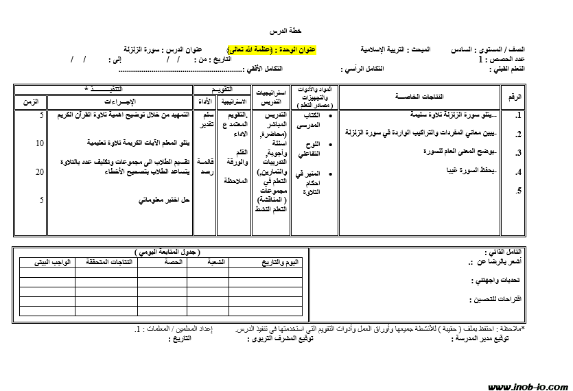 نموذج Word قابل للتعديل دفتر التحضير لمادة التربية الاسلامية الصف السادس الفصل الاول المنهاج الجديد
