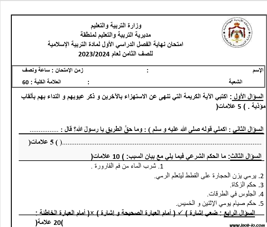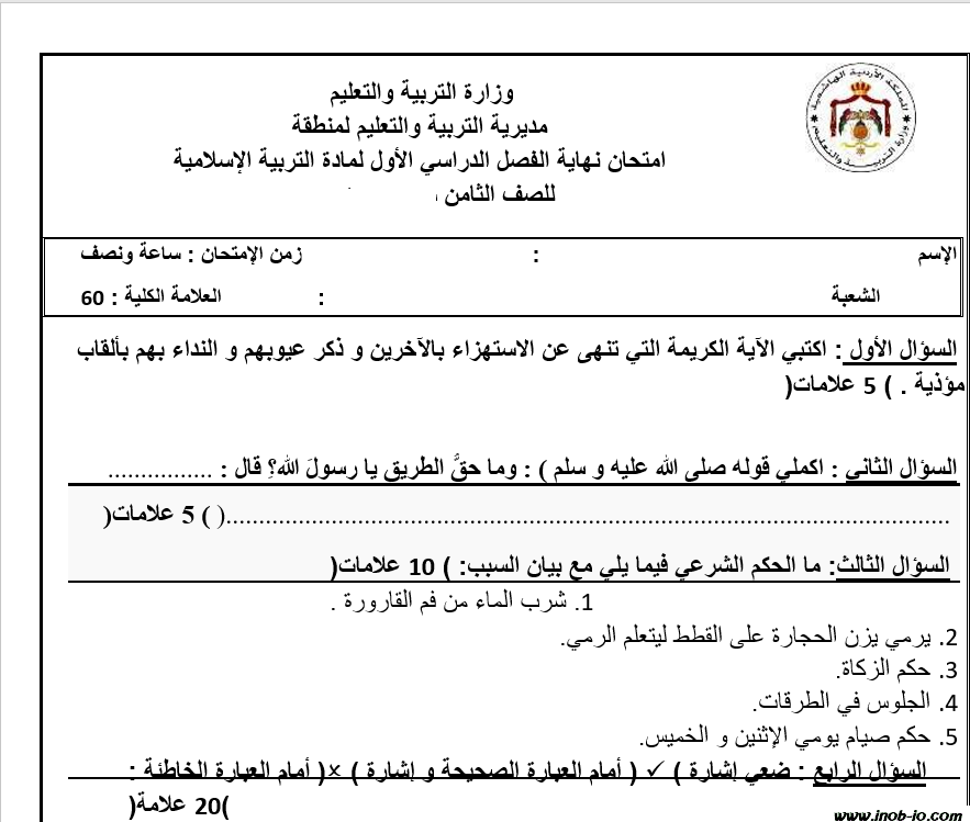 نموذج رقم -1- Word قابل للتعديل الاختبار النهائي لمادة التربية الاسلامية Collins الصف الثامن الفصل الاول