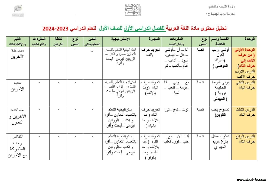 تحليل محتوى مادة اللغة العربية الصف الأول الفصل الأول المنهاج الاماراتي 2023-2024