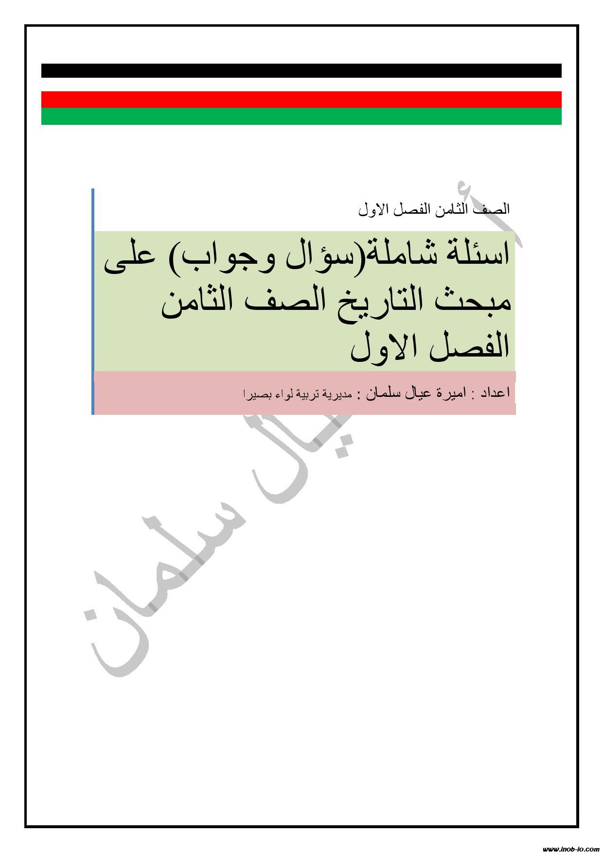 PDF أسئلة شاملة مع سؤال وجواب لجميع دروس مادة التاريخ الصف الثامن الفصل الأول 2023-2024