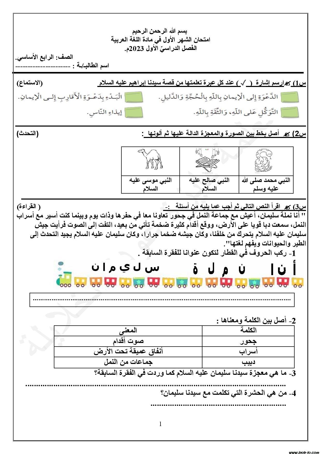 نموذج رقم -2- امتحان الشهر الاول لمادة العربية لغتي الصف الرابع الفصل الاول