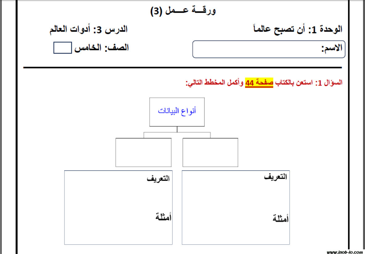 ورقة عمل أدوات العالم لمادة العلوم المتكاملة الصف الخامس الفصل الاول