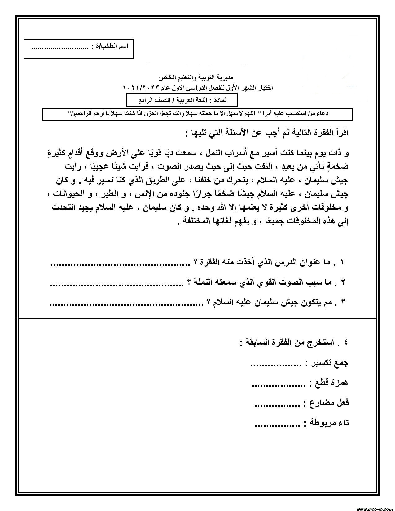 نموذج رقم -3- امتحان الشهر الاول لمادة العربية لغتي الصف الرابع الفصل الاول