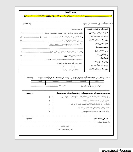 نموذج رقم -3- امتحان الشهر الاول لمادة العربية لغتي الصف السابع الفصل الاول