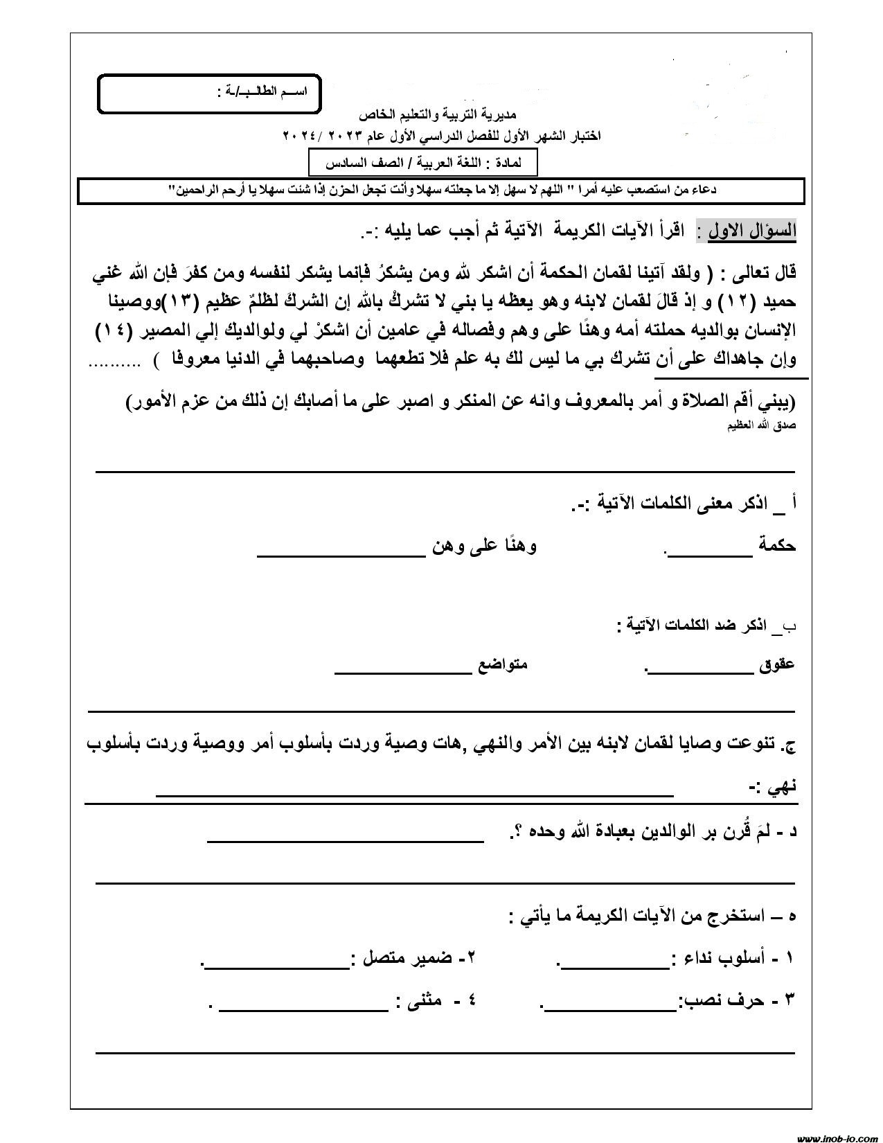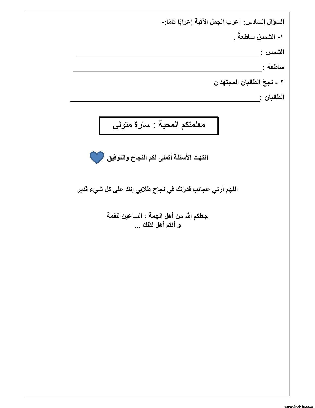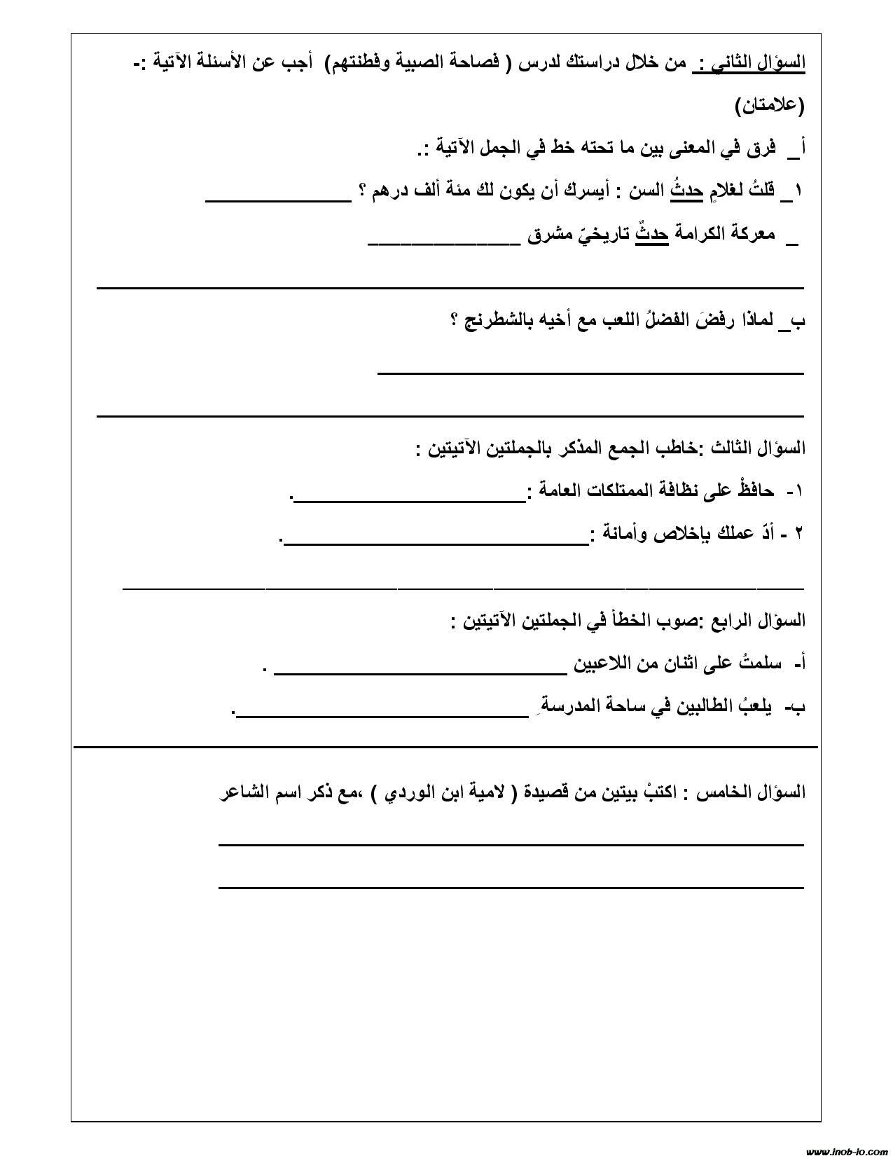 نموذج مصور امتحان الشهر الثاني لمادة اللغة العربية الصف السادس الفصل الاول