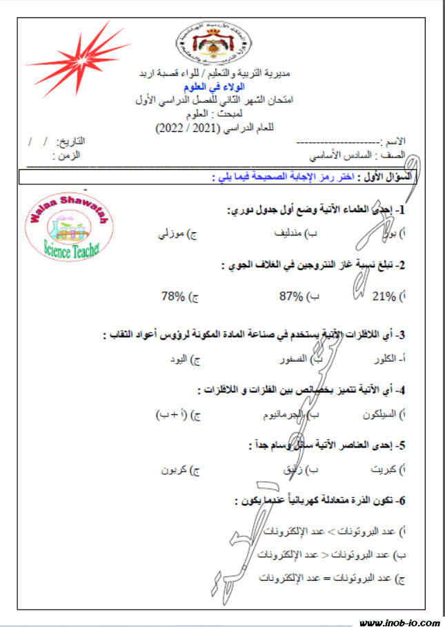 PDF اختبار الشهر الثاني لماده العلوم collins الصف السادس الفصل الأول نموذج 2
