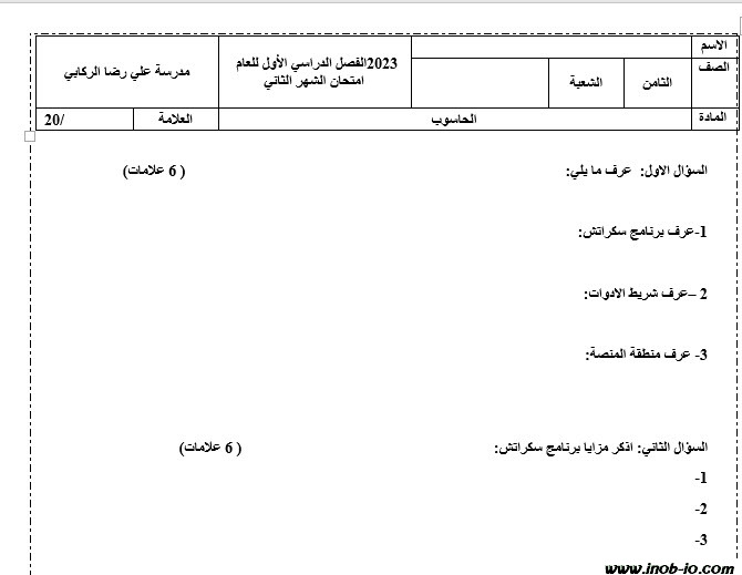 نموذج -3- Word قابل للتعديل امتحان الشهر الثاني لمادة الحاسوب الصف الثامن الفصل الاول