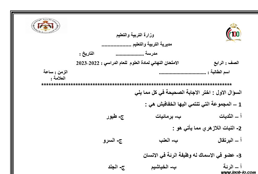 الاختبار النهائي لمادة العلوم collins الصف الرابع الفصل الاول