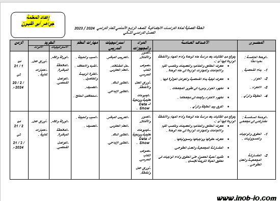 نموذج Word الخطة الفصلية وتحليل المحتوى لمادة الدراسات الاجتماعية الصف الرابع الفصل الثاني 2024-2025