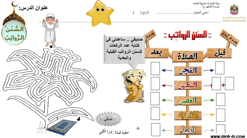 أوراق عمل درس السنن والرواتب لمادة التربية الإسلامية الصف الرابع الفصل الثاني المنهاج الإماراتي