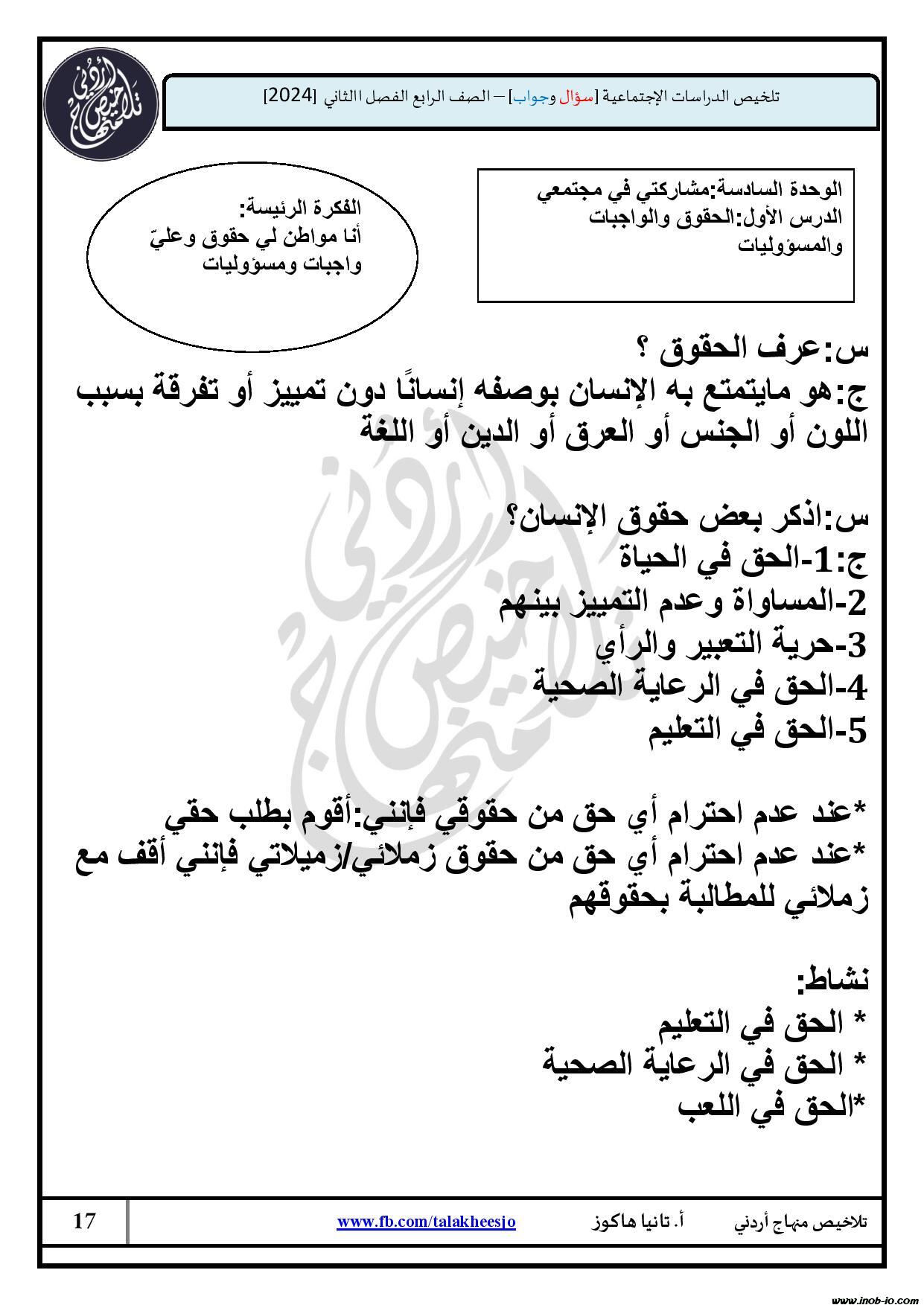 تلخيص سؤال وجواب لوحدة نحيا معا لمادة الدراسات الاجتماعية الصف الرابع الفصل الثاني