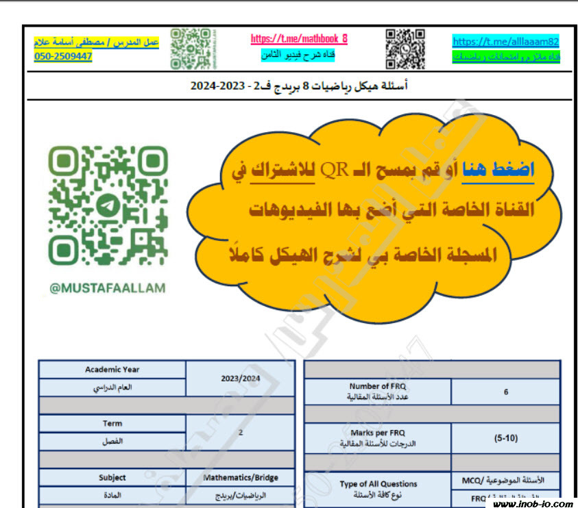 تجميع أسئلة هيكلة لمادة الرياضيات المتكاملة الصف الثامن عام الفصل الثاني