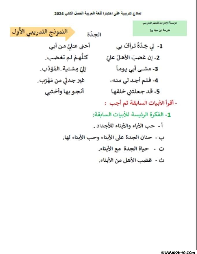 مجموعة :. نماذج تدريبية على اختبار مادة اللغة العربية الصف الثالث الفصل الثاني