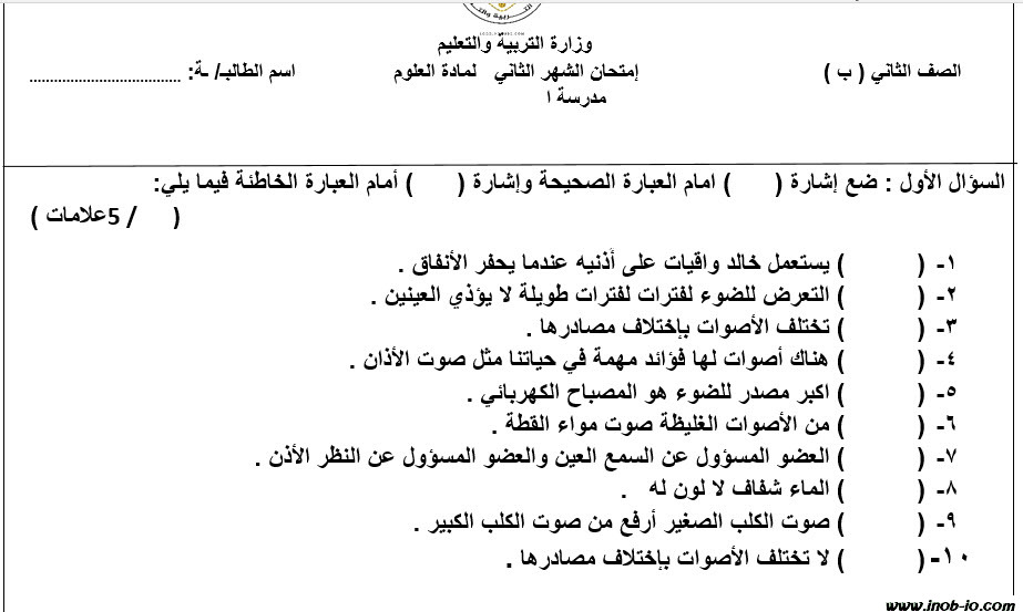نموذج-2- اختبار الشهر الثاني مادة العلوم Collins الصف الثاني الفصل الثاني