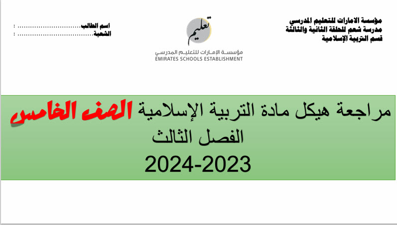 ملزمة مع مذكرة مراجعة هيكل الاختبار النهائي لمادة التربية الاسلامية الصف الخامس الفصل الثالث