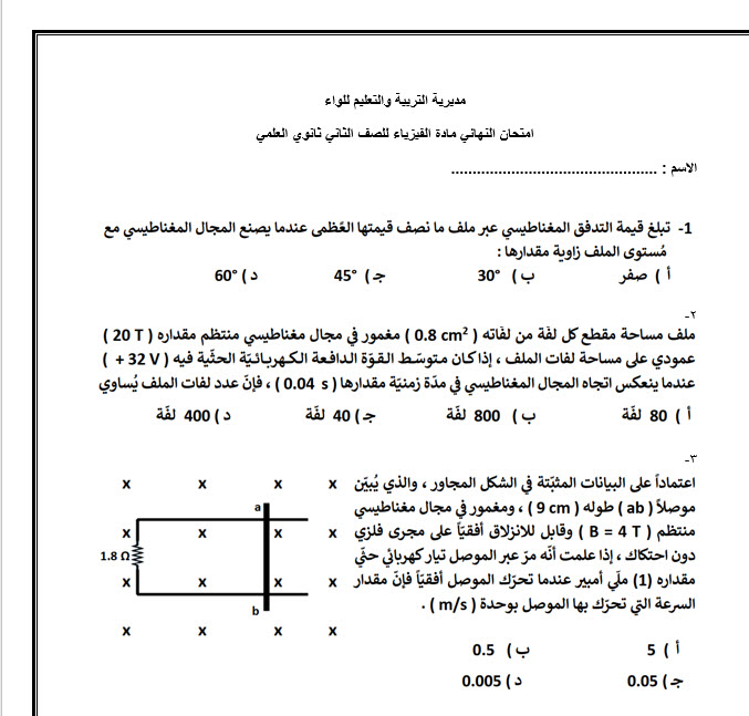 امتحان النهائي مادة الفيزياء للصف الثاني ثانوي العلمي