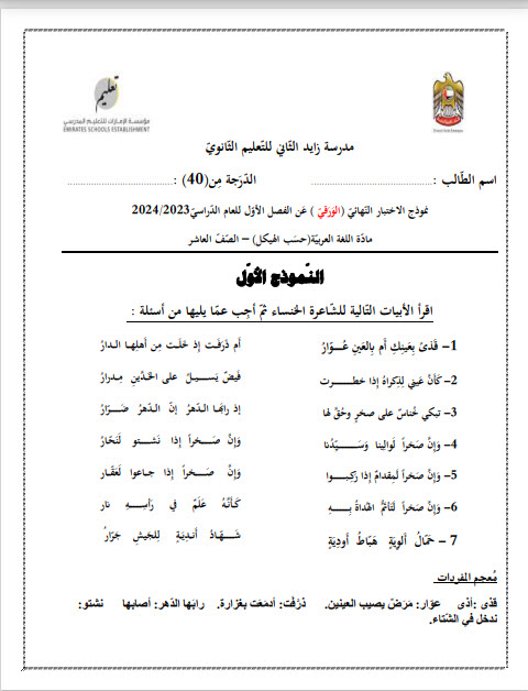 نموذج-1- اختبار نهائي ورقي اللغة العربية الصف العاشر الفصل الاول